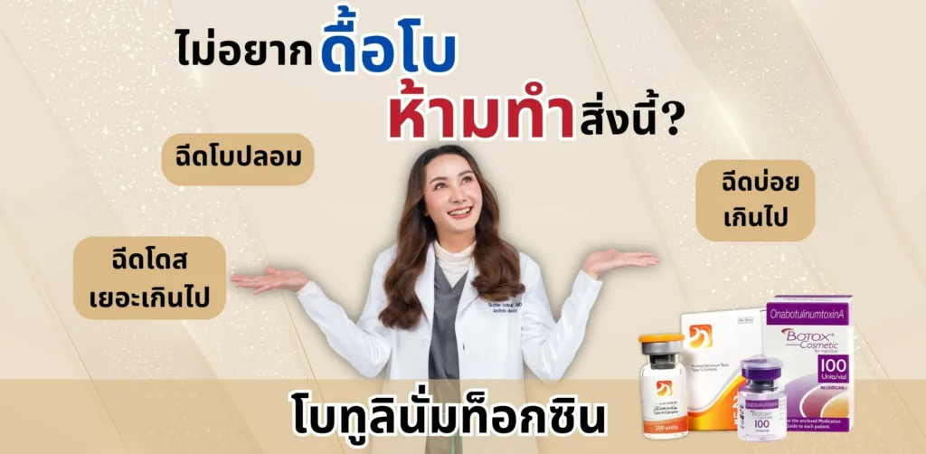 โบท็อกคืออะไร ? โบท็อก คือ ชื่อทางการค้าของ โบทูลินั่ม ท็อกซิน เอ (Botulinum Toxin Type A) ซึ่งเป็นสารสกัดจากแบคทีเรียที่มีชื่อว่า คลอสตริเดียม โบทูลินัม (Clostridium Botulinum) โบท็อกถูกนำมาใช้ในวงการเสริมความงาม เมื่อฉีดไปแล้วจะออกฤทธิ์ต่อระบบประสาท (Neurotoxin) มีผลทำให้มัดกล้ามเนื้อทำงานลดลงชั่วคราว ลดการขยับของกล้ามเนื้อ ช่วยลดริ้วรอย ลดกราม ปรับรูปหน้าและทำให้ผิวเต่งตึงได้ค่ะ   ข้อปฏิบัติตัวที่ควรรู้ก่อนและหลังฉีดโบท็อก สำหรับใครที่กำลังจะฉีดโบท็อกควรศึกษาข้อปฏิบัติตัว ก่อน-หลังฉีดให้ดีก่อนค่ะ เพื่อที่จะให้ผลลัพธ์ของการฉีดออกมาดีและคุ้มค่าที่สุด   ก่อนฉีดโบท็อกควรเตรียมตัวอย่างไร ? เลือกใช้โบท็อกแท้เท่านั้น ก่อนฉีดควรให้แพทย์ผสมโบท็อกให้ดูต่อหน้าทุกครั้ง เพื่อให้มั่นใจว่าไม่ได้เจือจางน้ำเกลือมากเกินไป ควรเลือกคลินิกที่ได้มาตรฐานและหมอที่มีประสบการณ์ ไม่ควรฉีดโบท็อกเกิน 300 ยูนิต ต่อครั้ง ระหว่างการฉีดควรประคบด้วยความเย็น เพื่อลดการไหลเวียนของเส้นเลือดรอบ ๆ   หลังฉีดโบท็อกควรปฏิบัติตัวอย่างไร ? หลังฉีดโบท็อกควรรีบขยับเกร็งกล้ามเนื้อที่ฉีดทันที 1-2 ครั้ง งดนอนราบ 3 ชม. หลีกเลี่ยงความร้อนทุกชนิดและกิจกรรมที่ทำให้หน้าแดง งดเครื่องดื่มแอลกอฮอล์ทุกชนิด […]